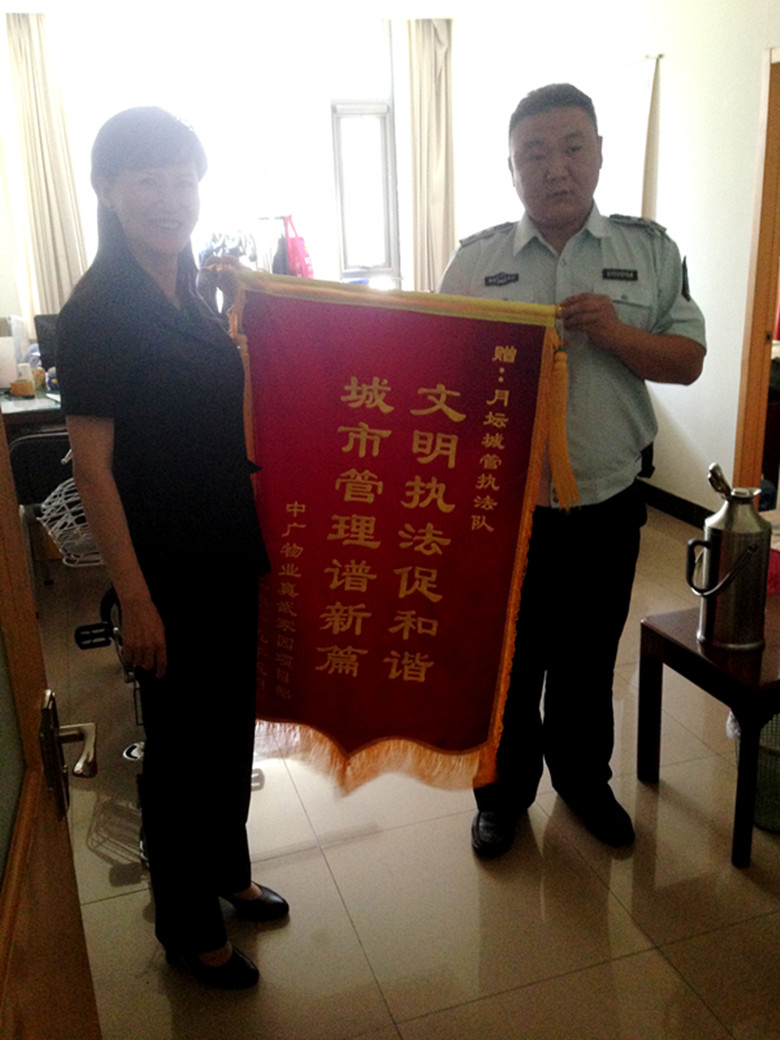 真武家園小區(qū)南門外長(zhǎng)期有小販在此擺攤賣水果、蔬菜,給小區(qū)業(yè)主出入造成諸多不便,由于是在小區(qū)大門外,小販們對(duì)物業(yè)管理不配合。為此真武家園項(xiàng)目部將此情況上報(bào)月壇城管執(zhí)法隊(duì),月壇執(zhí)法隊(duì)在短時(shí)間內(nèi)就將長(zhǎng)期在真武家園南門擺攤的小販們徹底清除。為了感謝月壇城管執(zhí)法隊(duì)對(duì)項(xiàng)目部工作的支持,2015年5月19日,真武家園項(xiàng)目部特向月壇城管執(zhí)法隊(duì)贈(zèng)送錦旗“文明執(zhí)法促和諧,城市管理譜新篇”,以示感謝。