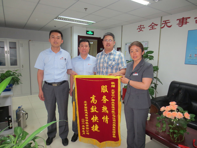 2015年5月18日,北京國煤建裝飾責任有限公司的項目經理田曉濤將一面印有“高效快捷,服務熱情”的錦旗送到中廣物業(yè)地圖出版集團項目部儲新院主管的手上,并對項目在其裝修施工期間,給予的大力支持和幫助表示衷心的感謝!