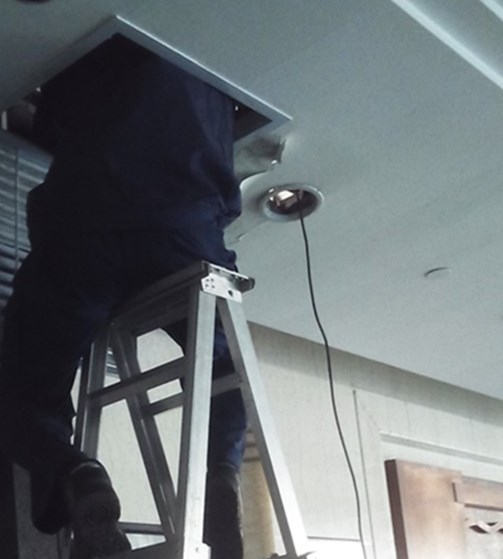 在將已被水浸透的頂板拆除后,維修人員發(fā)現(xiàn)中央空調(diào)供水管道有漏水現(xiàn)象,隨即使用容器采用調(diào)換的方式接水。隨著水壓的降低,將保溫層打開后,發(fā)現(xiàn)空調(diào)管道已嚴(yán)重銹蝕并有破損現(xiàn)象,需進(jìn)行更換才能消除漏水點(diǎn)。
