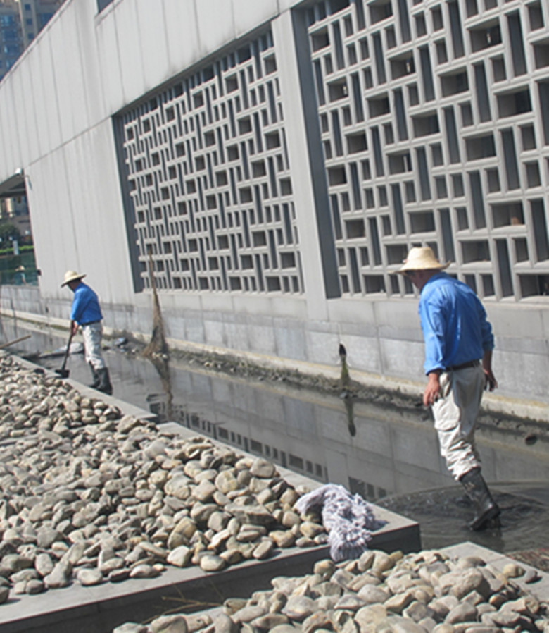 當日,傅國輝經(jīng)理親臨現(xiàn)場指揮,省博項目李海洋經(jīng)理、設備維保部主管李敏森親自下池清鏟淤泥,在炎炎夏日下,省博項目設備維保部員工利用沙袋把被“綠色”污染的池水分段隔開,然后使用抽水泵將隔斷中的池水抽走,不辭辛苦地將景觀池中的鵝卵石清掏,清運掉淤泥,以恢復景觀池往日明溪。
