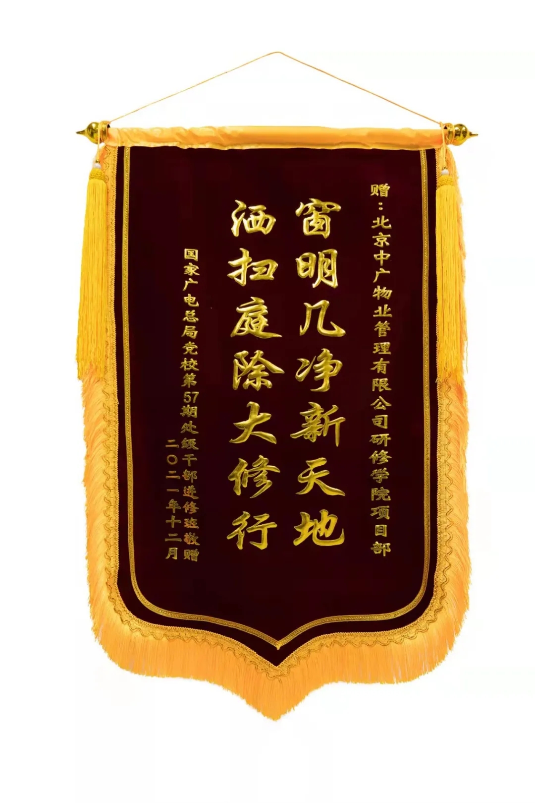 近日,中廣物業(yè)公司總局研修學院項目部收到國家廣電總局黨校第57期處級干部進修班全體學員贈予“窗明幾凈新天地 灑掃庭除大修行”錦旗。這面錦旗背后所表達的是全體學員對公司物業(yè)服務的高度認可與誠摯感謝,也體現(xiàn)了全體學員對項目部服務人員的信任和支持。