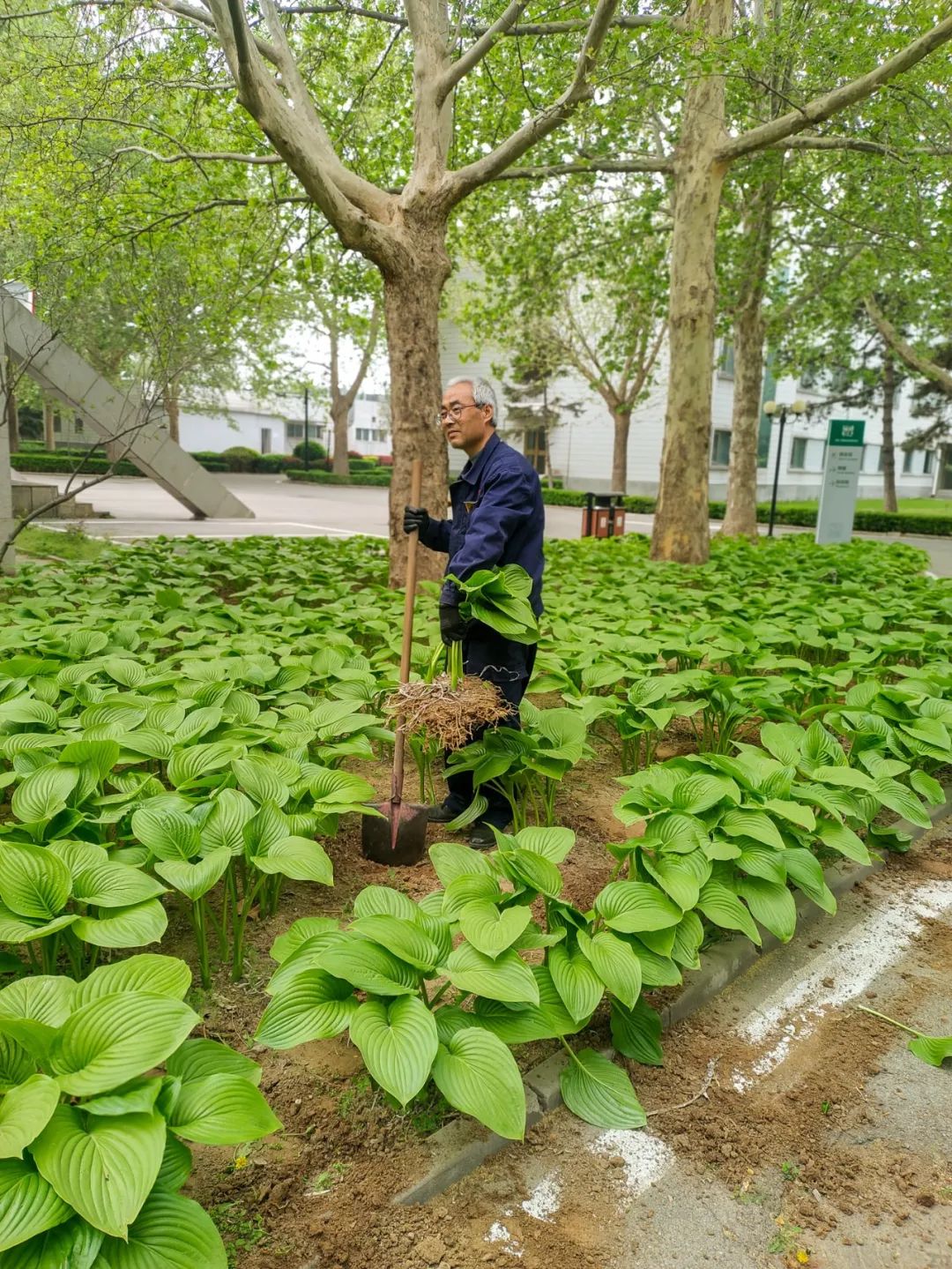 移植活動(dòng)開始前,綠化專業(yè)人員即在綜合館東北角的“移栽區(qū)”清理雜草、翻整土地,為玉簪移植開拓場(chǎng)地以創(chuàng)造適宜的生存條件。隨著移植活動(dòng)正式開始,男員工在綜合館西北側(cè)玉簪地進(jìn)行間苗,女員工將移出的玉簪搬運(yùn)至種植區(qū)。大家間苗的間苗、搬運(yùn)的搬運(yùn)、種植的種植,積極主動(dòng)、相互配合、干的熱火朝天,用時(shí)約2個(gè)小時(shí)共計(jì)移植玉簪400余株,完成60平米的移栽工作。整個(gè)過程采用間苗、挖坑、放置玉簪、封土的流水線式作業(yè),最后澆水以提高成活率。