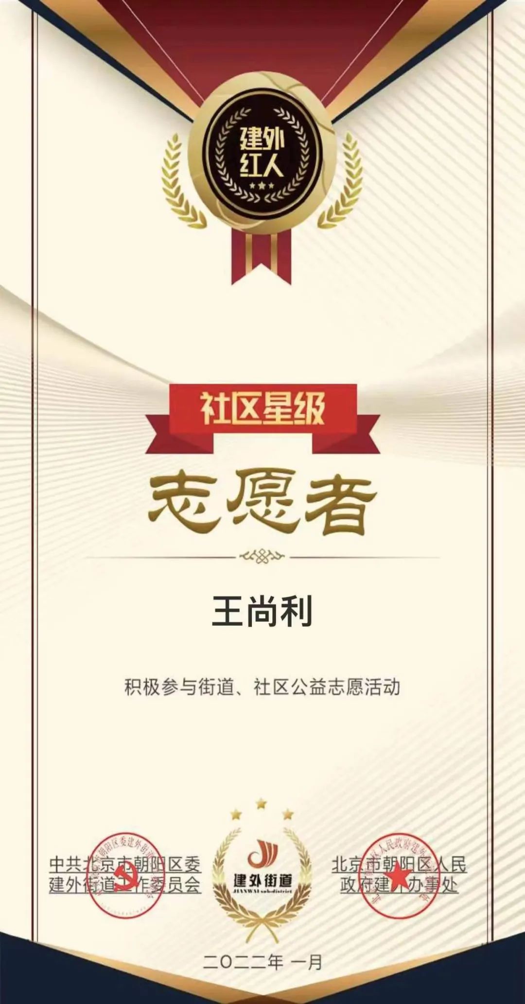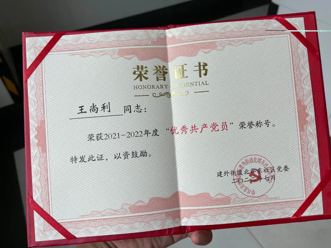 2022年7月1日,在慶祝中國(guó)共產(chǎn)黨成立101周年之際,朝陽(yáng)區(qū)建外街道北郎東社區(qū)對(duì)轄區(qū)優(yōu)秀黨員進(jìn)行表彰。北京中廣物業(yè)管理有限公司總局項(xiàng)目部光輝里項(xiàng)目王尚利同志被評(píng)為優(yōu)秀共產(chǎn)黨員和社區(qū)星級(jí)志愿者。