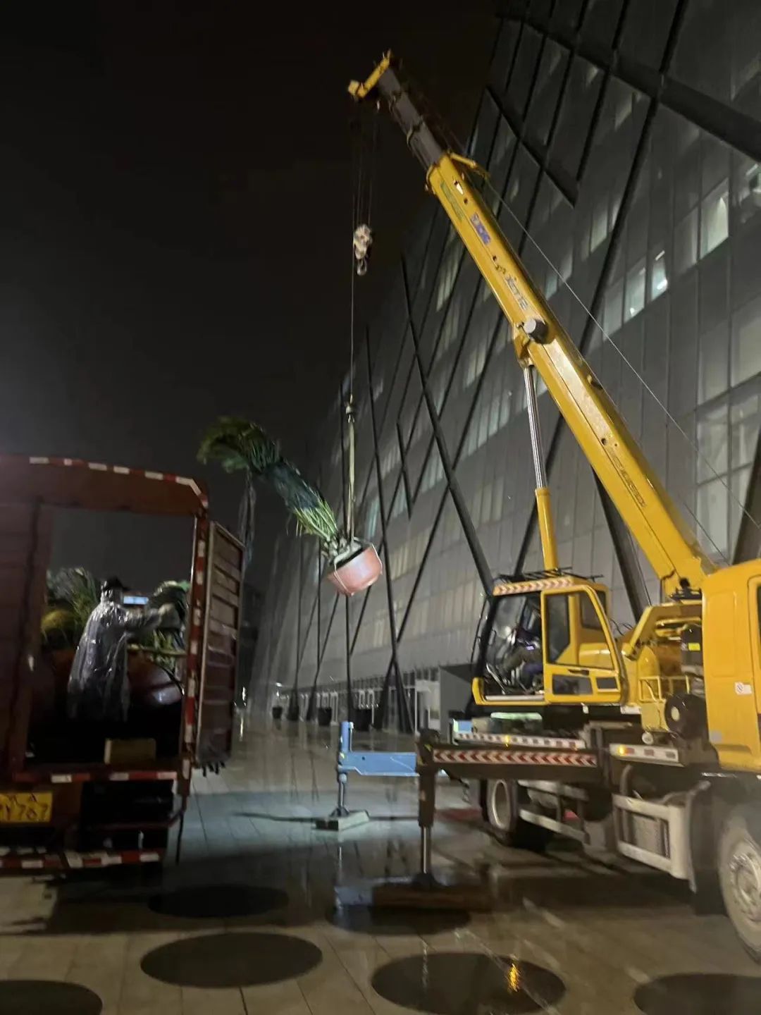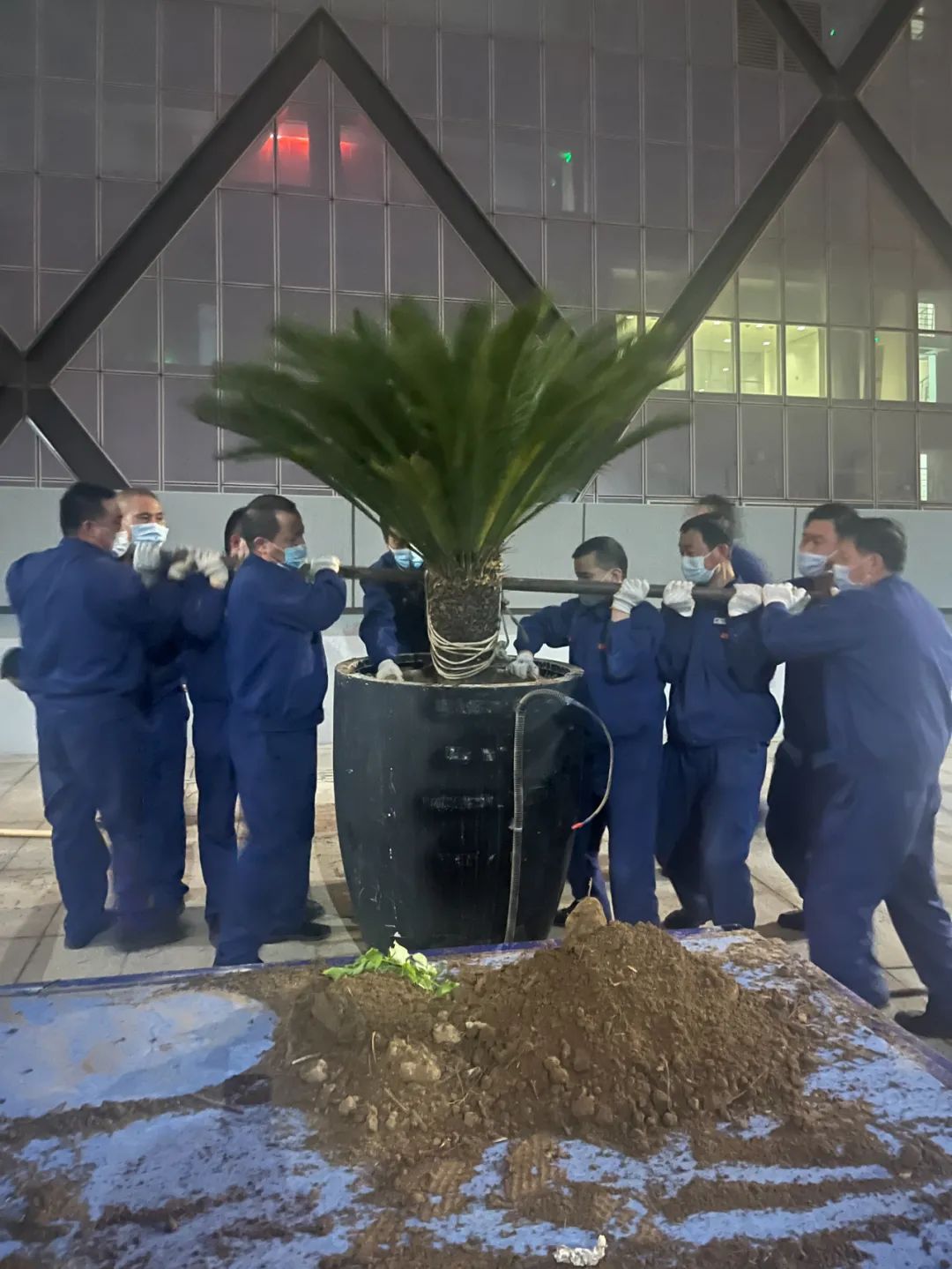 為盡可能將大型盆栽季節(jié)性更換工作對總臺辦公區(qū)域影響降低,同時方便綠植運(yùn)輸及吊運(yùn)車輛進(jìn)出,公司決定利用夜間辦公人員相對較少時段進(jìn)行作業(yè)。公司領(lǐng)導(dǎo)及相關(guān)部門負(fù)責(zé)人親臨現(xiàn)場督導(dǎo)協(xié)調(diào),從傍晚六點(diǎn)至次日凌晨三點(diǎn),共計出動員工20余人,大家不顧深夜低溫,冒雨進(jìn)行吊裝、轉(zhuǎn)運(yùn)、種植、加固等操作,最終將光華路辦公區(qū)主樓外圍7棵海藻樹和15棵鐵樹種植完成,并將近4米高的22棵云杉樹重新轉(zhuǎn)運(yùn)移栽至總臺指定地點(diǎn)進(jìn)行養(yǎng)護(hù),為冬季景觀打造奠定堅實(shí)基礎(chǔ)。