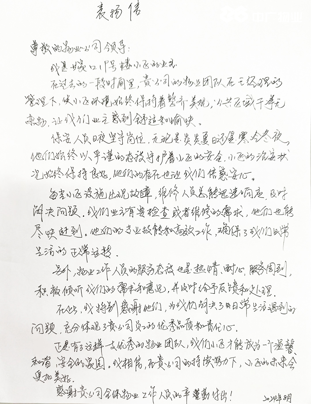 來(lái)信稱(chēng),在過(guò)去的一段時(shí)間里,公司物業(yè)團(tuán)隊(duì)服務(wù)工作細(xì)致周到,積極傾聽(tīng)業(yè)主的需求和意見(jiàn),幫助解決日常生活中遇到的問(wèn)題,充分體現(xiàn)了中廣人熱情、耐心的服務(wù)態(tài)度和高度責(zé)任感。同時(shí),保安人員日夜堅(jiān)守崗位,小區(qū)的治安狀況始終保持良好,讓業(yè)主倍感安心;每當(dāng)業(yè)主家中報(bào)修,維修人員總能迅速響應(yīng),高效處置,憑借專(zhuān)業(yè)的技能,確保業(yè)主生活正常運(yùn)轉(zhuǎn);保潔人員辛勤付出,使小區(qū)環(huán)境始終保持著整齊美觀,公共區(qū)域干凈無(wú)雜物,讓業(yè)主感到舒適和愉快。感謝公司物業(yè)團(tuán)隊(duì)的辛勤付出,小區(qū)的未來(lái)會(huì)更加美好。