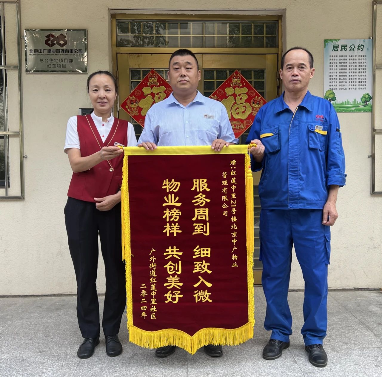 近日,廣外街道紅蓮中里社區(qū)向北京中廣物業(yè)管理有限公司紅蓮項(xiàng)目送上一面寫有“服務(wù)周到 細(xì)致入微 物業(yè)榜樣 共創(chuàng)美好”字樣的致謝錦旗,感謝公司對社區(qū)工作的大力支持。
