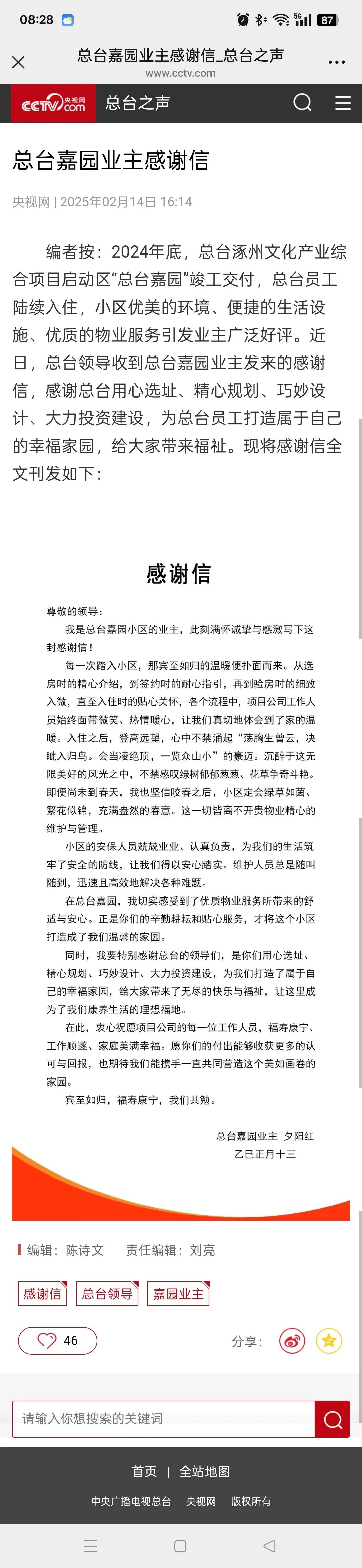 據(jù)央視網(wǎng)總臺之聲報道,近日,總臺領(lǐng)導(dǎo)收到總臺嘉園業(yè)主“夕陽紅”發(fā)來的感謝信,信中感謝總臺用心選址、精心規(guī)劃、巧妙設(shè)計、大力投資建設(shè),還對中廣物業(yè)公司優(yōu)質(zhì)服務(wù)給予表揚。