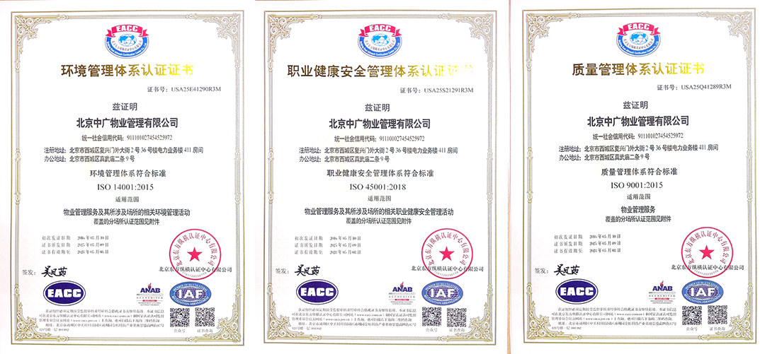 近日,北京中廣物業(yè)管理有限公司迎來質(zhì)量、環(huán)境、職業(yè)健康安全管理體系再認證審核。經(jīng)過全面評審,認證單位審核組評定公司三體系運行全面符合國家標準及認證要求,并正式向公司頒發(fā)了質(zhì)量、環(huán)境、職業(yè)健康安全管理體系認證證書。